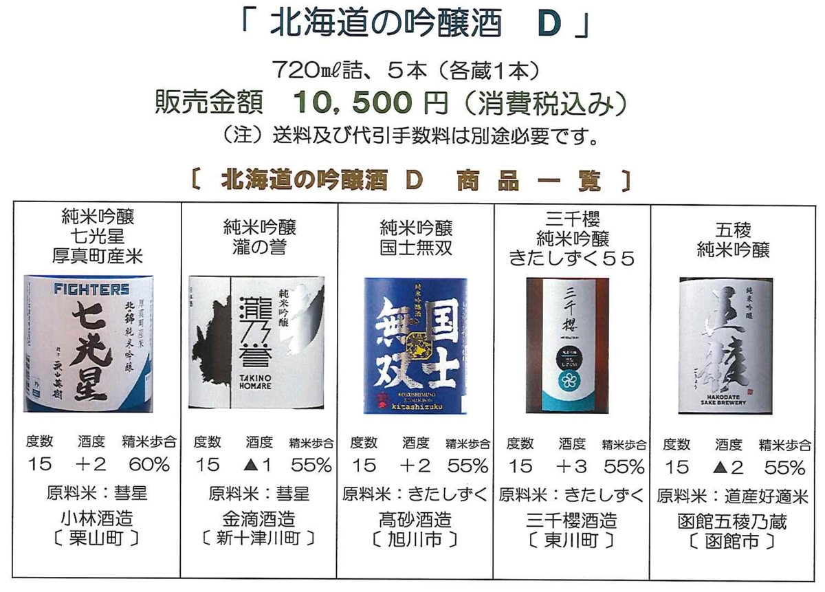 「北海道の吟醸酒 D」 七光星〔小林酒造〕、瀧の誉〔金滴酒造〕、国士無双〔高砂酒造〕、三千櫻〔三千櫻酒造〕、五稜〔函館五稜乃蔵〕セット